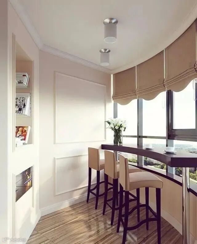 若是阳台相对较长的话,那么在阳台的侧边安放吧台,这样的设计会更加实在,既不会占用太多阳台的位置,又能实现情趣舒适的吧台功能。