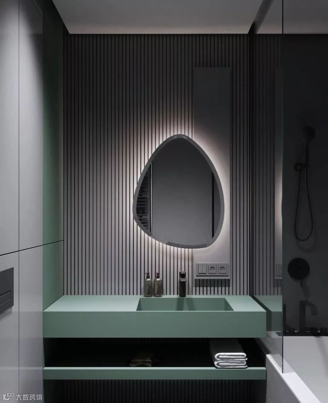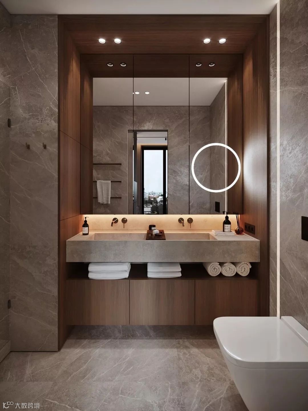 另外,洗漱台的底部可以依照自己的喜好来选择,做成开放式隔板或者封闭式的柜子,或者干脆进行混搭设计,都能满足毛巾及一部分洗漱用品的收纳需求。
