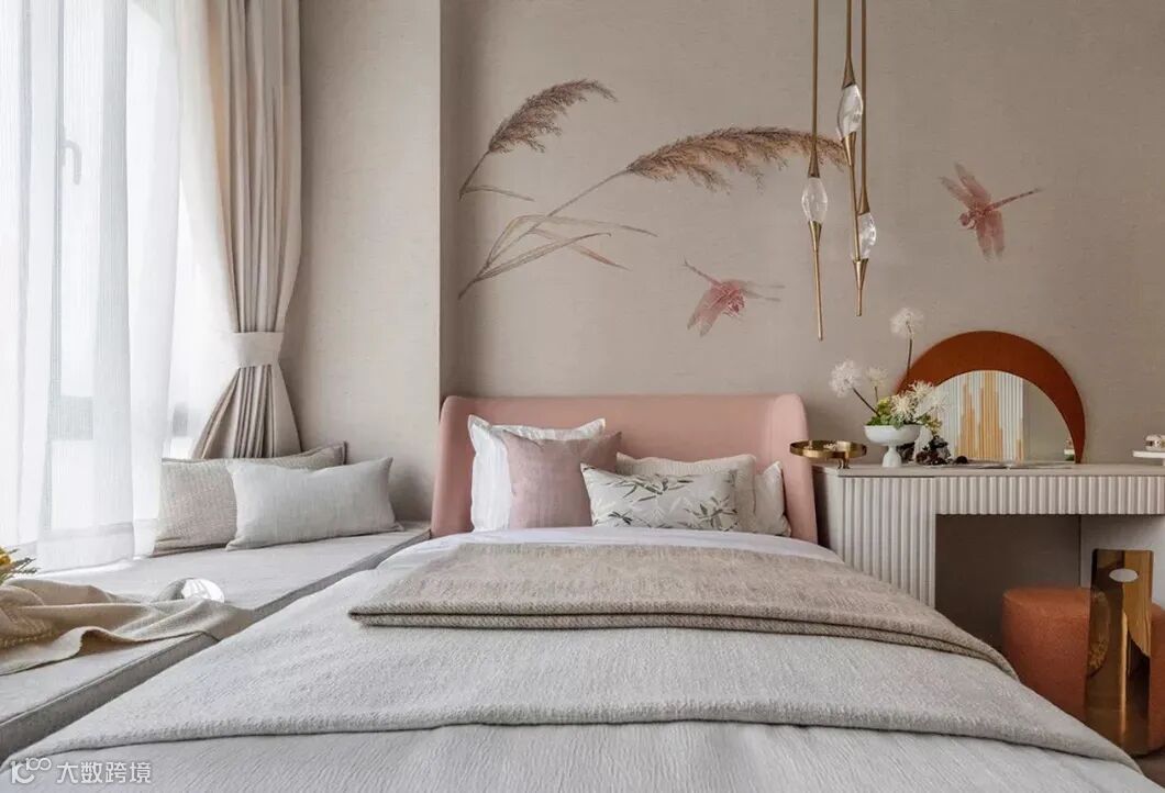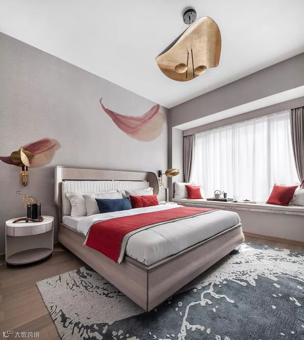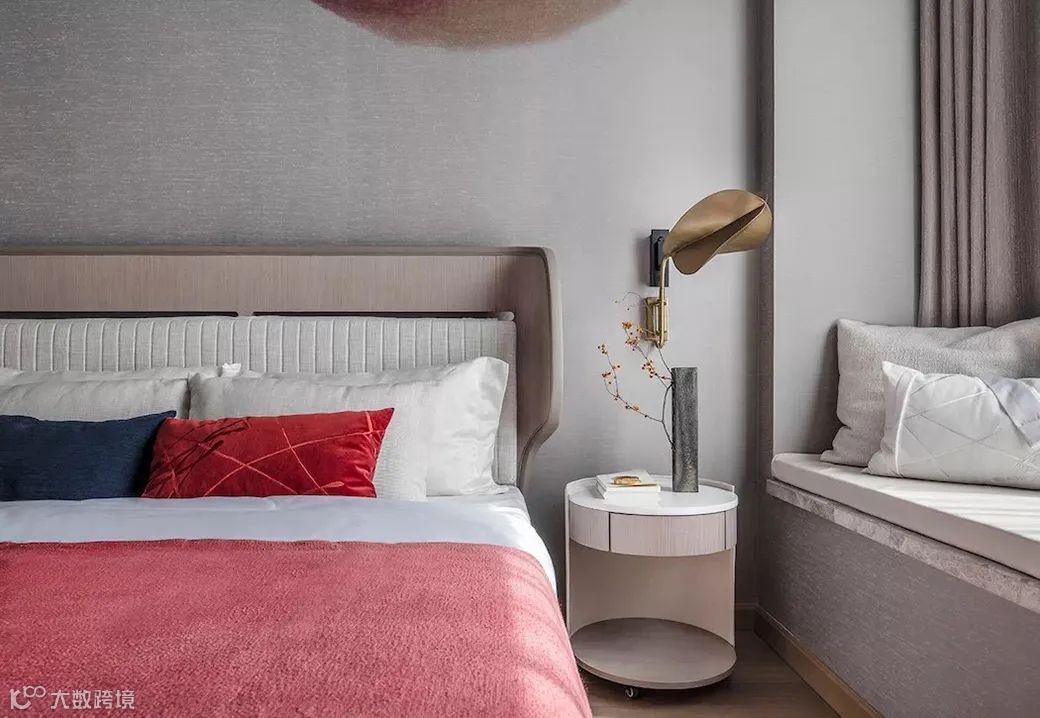明月映花花映人,主人房仿似湖边花涧,月下花影,一切陈设落得简凝妥当。绯红、杏黄、月白,色彩的糅合,布艺与黄铜的质感碰撞,以含蓄的现代方式诠释东方意境,追求中式美感的同时,融汇西方文化的品质追求。