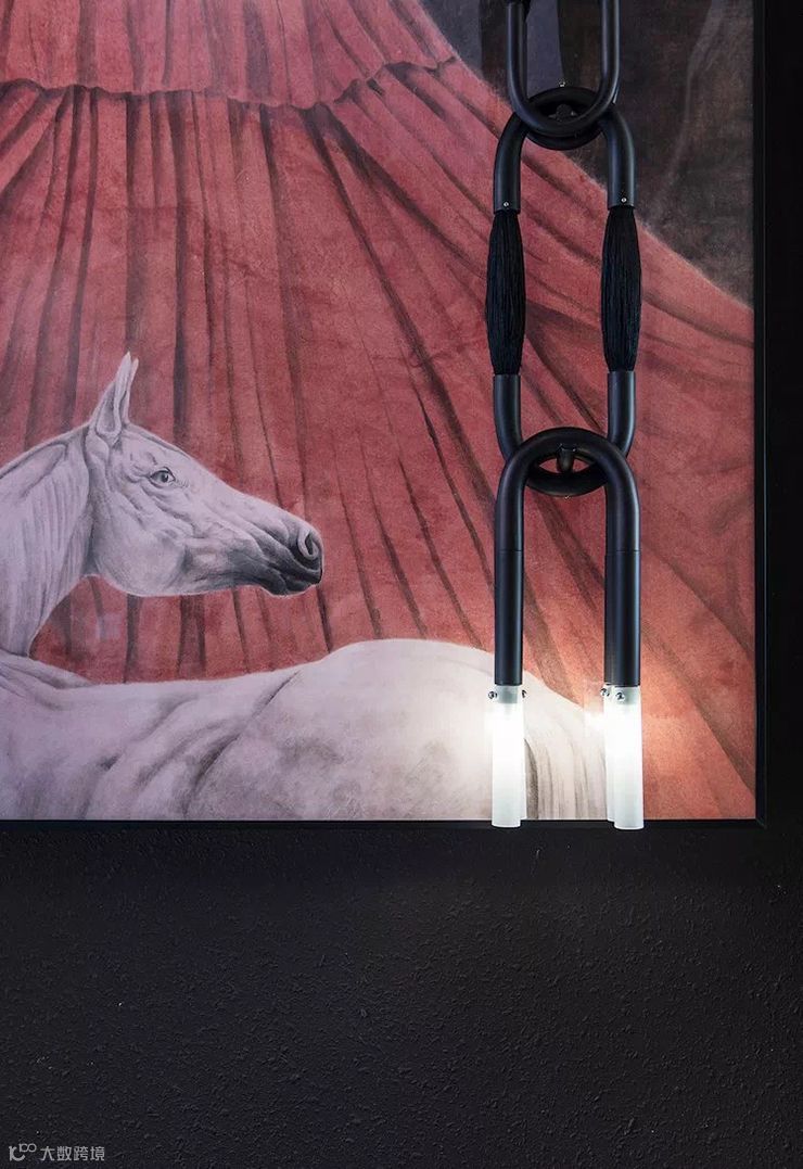 笔下有白马,吊灯即毛笔。知名艺术家徐累的水墨画作品,将白马描绘得栩栩如生,而白马的灵动则具指引性,从“户外”引向“内景”,超越事物本身,指向感官,指向精神,内心渴望驰骋在大地上,带来艺术层面的思考。