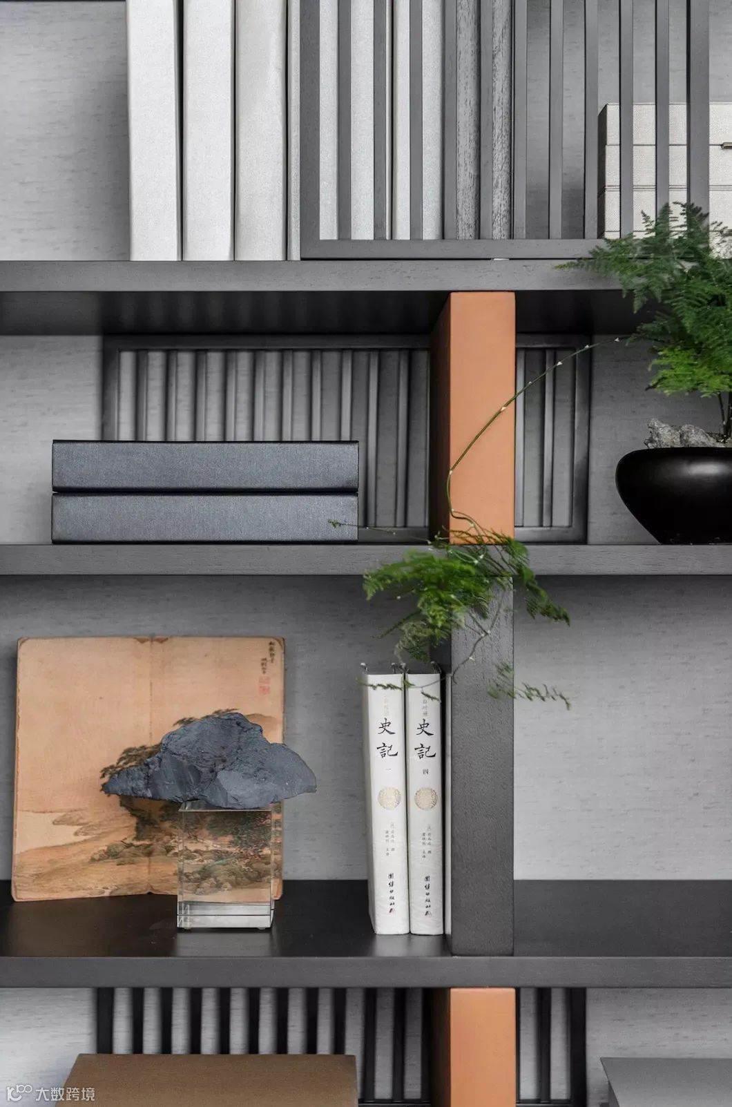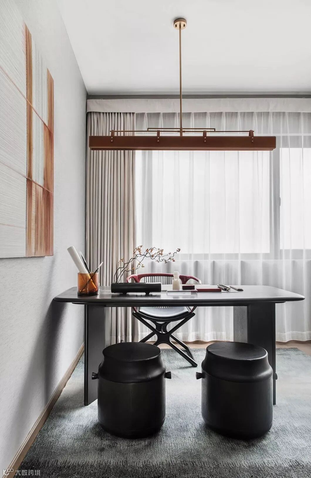 书房凝结东方美学精髓的悠远气韵,寻得清幽之处,让思绪伴着墨香尽情挥洒。书籍藏物整齐列架,倚墙而立,文竹摆件、卷帙画幅,挥洒一纸墨香晕染画中,令人在这隅沉浸式的精神之地中随心享受。