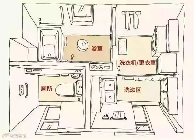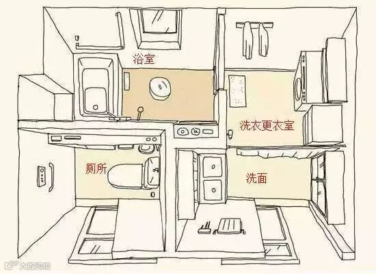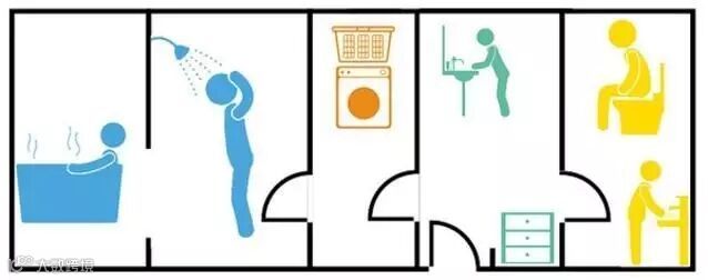 四式分离,不浪费空间的每1㎡,将厕所、洗手池、浴室(包括浴缸和淋浴)以及洗衣机分开设置,称为“四式分离”。