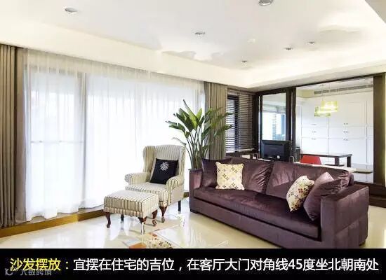 沙发可以说是家庭的焦点,一家老小日常坐卧都在那里,若将沙发摆放在住宅的吉位,则一家人都可沾染旺气,全家平安。一般来说,住宅的吉方在客厅大门对角线45度坐北朝南处。