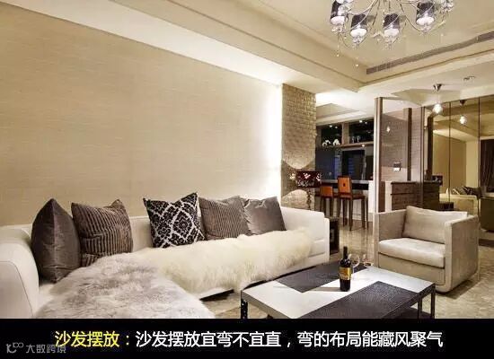 沙发在客厅中的重要地位,犹如国家的重要港口,必须能尽量多纳水,才可兴旺起来。优良的港口必定两旁有伸出的弯位,形如英文字母的“U”字。伸出的弯位犹如两臂左右护持兜抱,而中心凹陷之处正是风水的纳气位,能藏风聚气,以达致丁财两旺。沙发的摆设亦应如先进的港湾一样,两旁各有一臂伸出为宜。