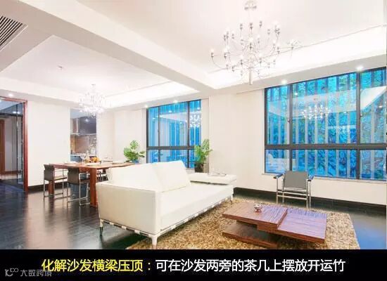 化解方法:若实在不能移动沙发,则可在沙发两旁的茶几(茶几装修效果图)上摆放开运竹,以不断生长向上、步步高升的开运竹来化解横梁压顶。