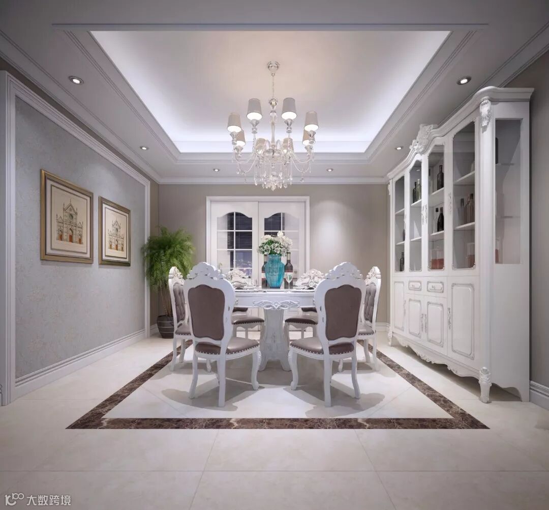 餐厅的设计装饰都具有强烈的欧式感觉,造型独特的吊灯,白色的桌椅金色边框挂画给人大气简洁的感觉。