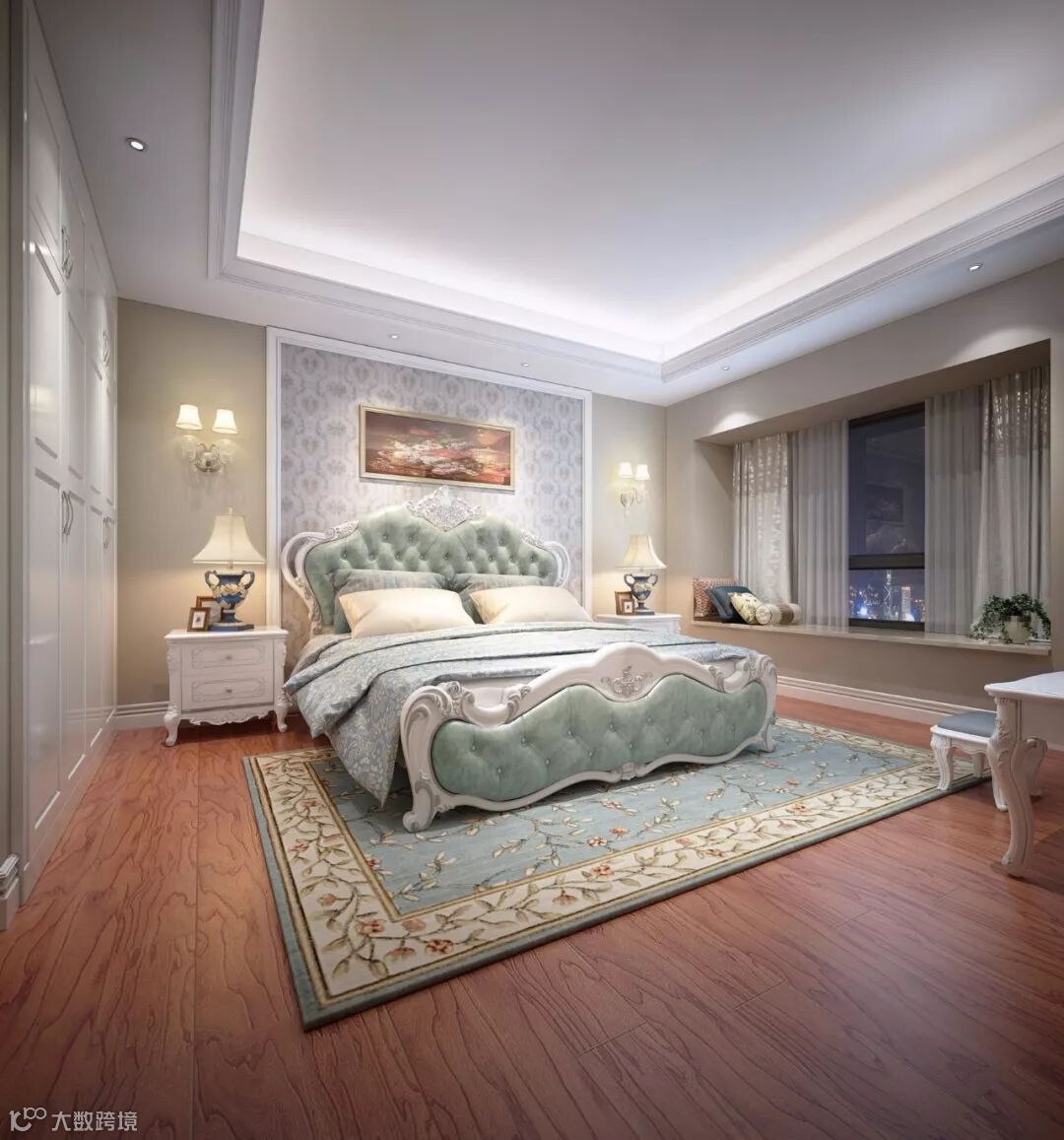 淡绿色的优雅,加上其他欧式软装布置,浪漫中带着精致的轻奢气息。连地毯都选择了与床边颜色匹配的地毯,更彰显设计的用心。