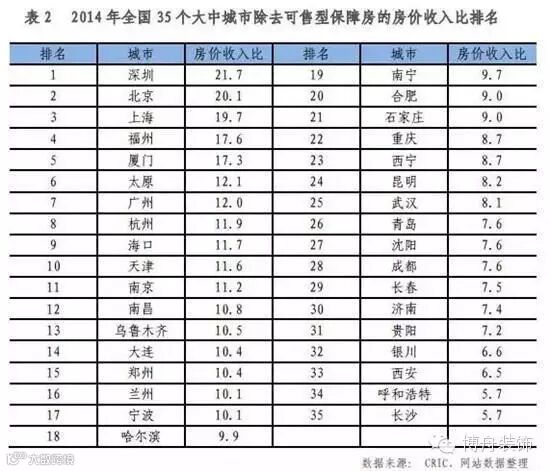 如图所示,在易居房地产研究院《全国35个大中城市房价收入比排行榜》排行榜中,深圳、厦门、北京冲进前三甲,35个大中城市房价收入比均值为8.7。值得注意的是,在2014年全国35个大中城市房价收入比排名中,深圳的房价收入比超过了20,位居第一位,其次是厦门、北京、上海、广州、杭州和福州,几个城市的房价收入比分别达到了15.5、14.5、11.9、11.8、10.8和10.8。以深圳为例,它的房价收入比为20.2。2013年深圳的房价收入比还只有18,如今已经飙升到近22.2,也就是说在深圳,一个达到该市平均收入水平的家庭,如果购买一套100平方米的普通商品住房,实际上要耗费20多年才能得偿所愿。