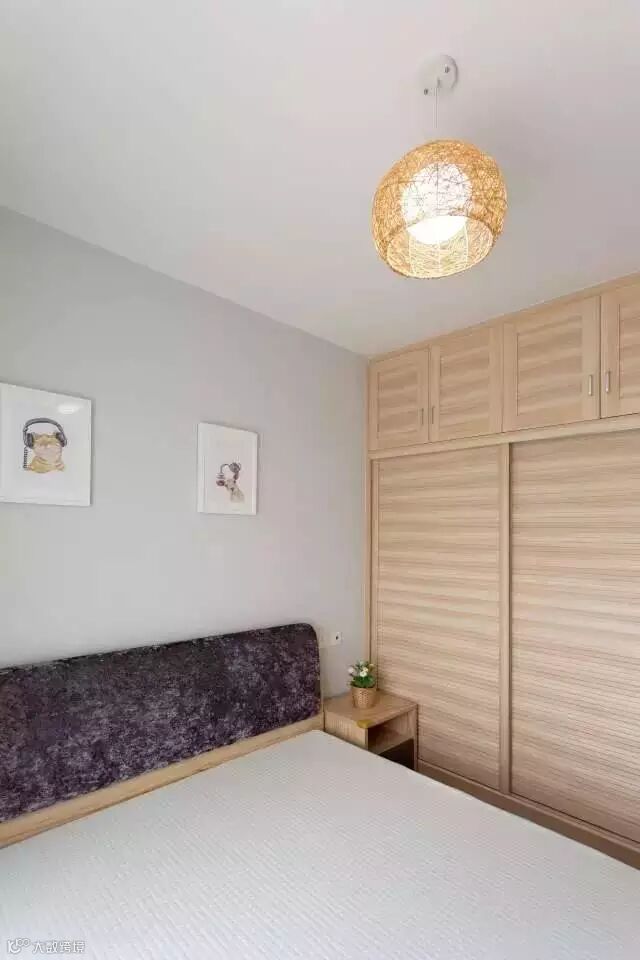 简单的卧室因为床头的两个可爱的壁画而显得十分有生机。主卧还是用了顶天立地的大衣柜,放在墙角也不占位置。