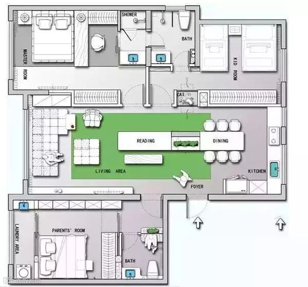 空间展现的非常好,几乎考虑了所有人的需求,竟然连宠物的空间都考虑进去了。刚有两个女儿,带着父母一起住,人员功能确实是必要的。孩子房可以用上下铺,功能上就会更多了或空间更大了 。