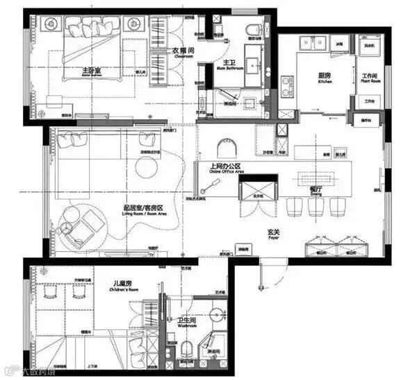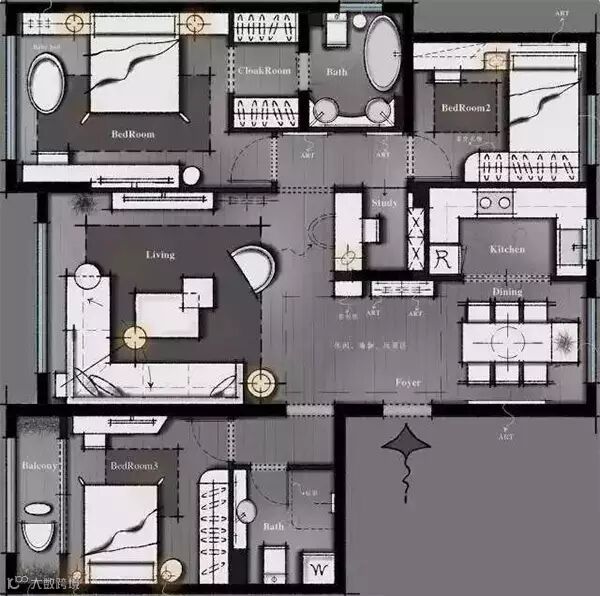 第一眼,季氏风格,相关材料质的搭配和效果都很完整。空间感也十分的规整国际范十足,但细看方案少一个客房功能,有些讨巧。好的设计以人为本,先要满足日常的生活需求,这个并不是做样板房。满足不了业主的诉求,也只是飞机稿。