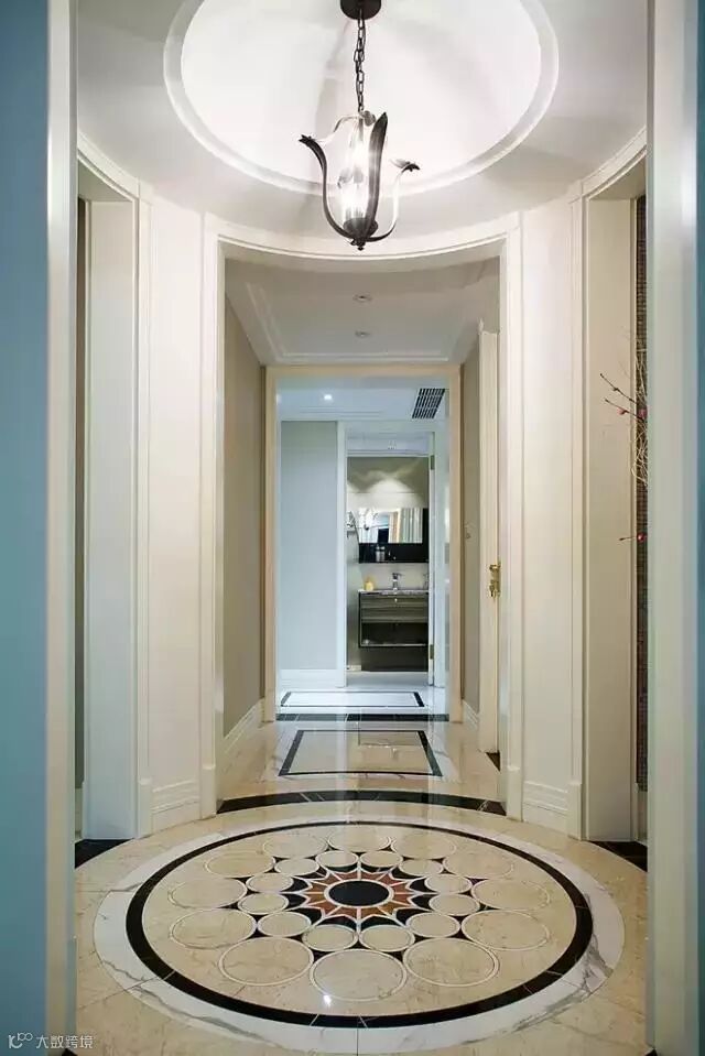 入户门厅的尽头是起居室,使用了门框分割了两个空间,既保留空间的独立性又能让视觉延伸到远处的石材背景。