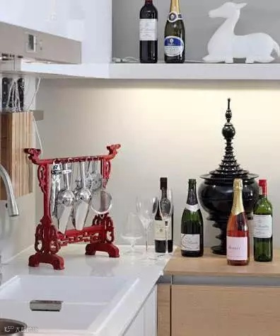 收纳tips:厨房的墙角,用一个定制的转角收纳架填补,红色的收纳架也较为精致,用来收纳启瓶器、勺子等小巧的物品,让厨房的桌面空间变得井井有条。