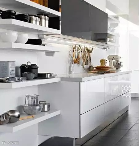 收纳tips:橱柜太少装不下太多的杂物,可以设置多层的搁板,像展示品一样的展示出他们的品味,即使它只是小小的一罐盐。