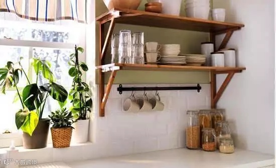收纳tips:料理台上方的墙面空间可不要浪费了哦,装上木质搁架,放置餐具、调味罐等绰绰有余哦!高处通风良好,餐具、调料不易受潮,产生细菌。