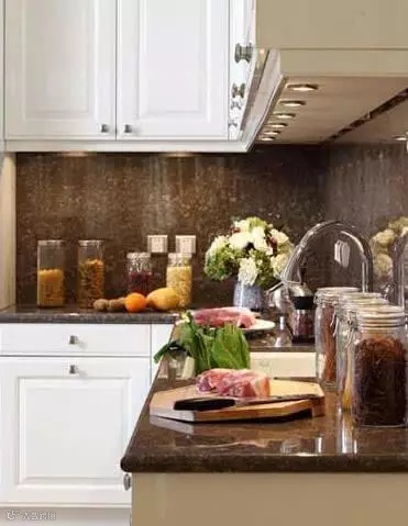 收纳tips:大大小小的玻璃罐子来装粗粮、盐、茶叶、果酱,这是厨房收纳中很好的习惯,小物品的收纳往往是厨房清洁程度的关键所在,欧巴们的厨房是不会让食物腐烂于角落的。