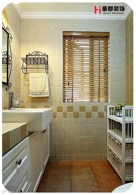 ▲卫生间仿古砖墙体地面,铁艺装饰品。