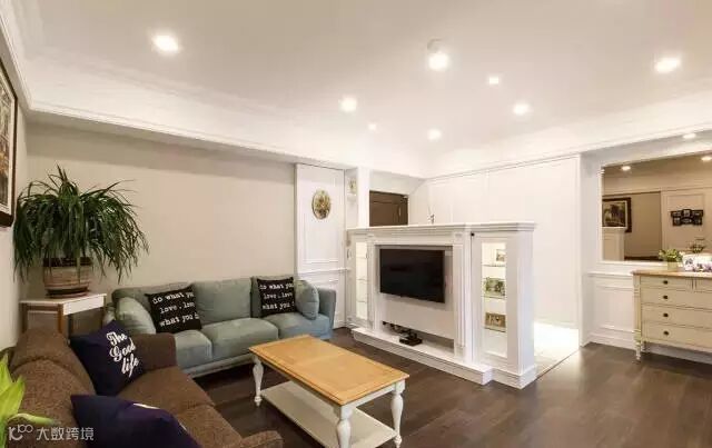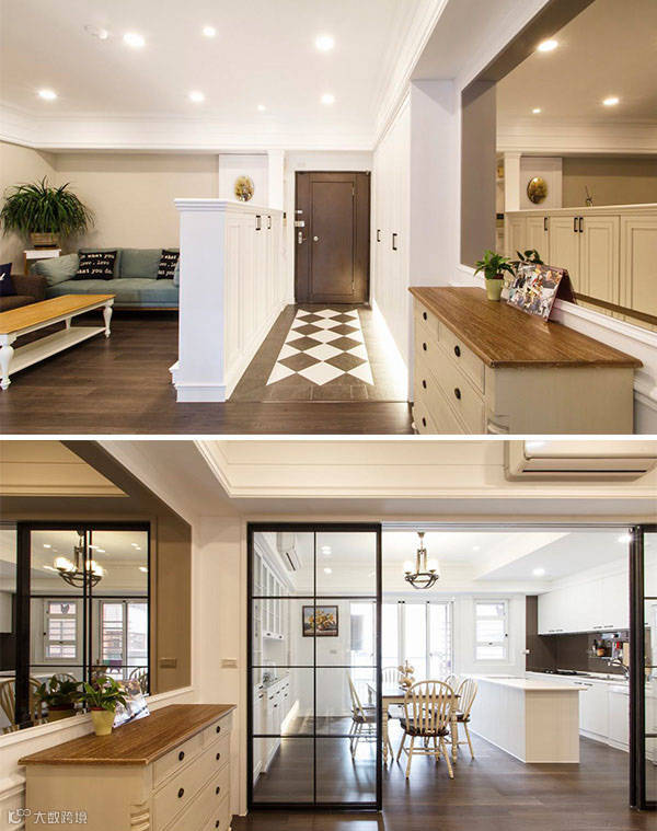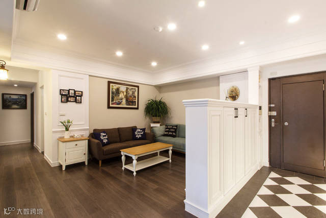 美式风格的白色柜体,除作为玄关区的鞋柜使用外,亦为厅区的电视背墙。
