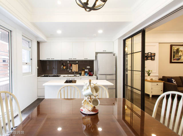 以铁件玻璃格窗作为餐厨区与客厅的隔间,让仅有的单面采光得以延伸至玄关及客厅,活动式的拉门,亦可创造出大尺度的开放式空间。