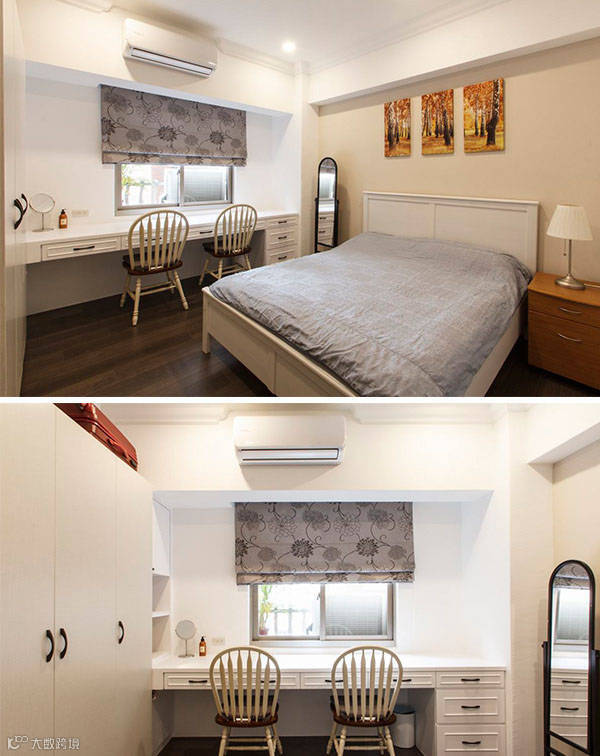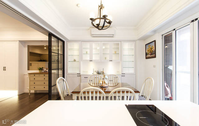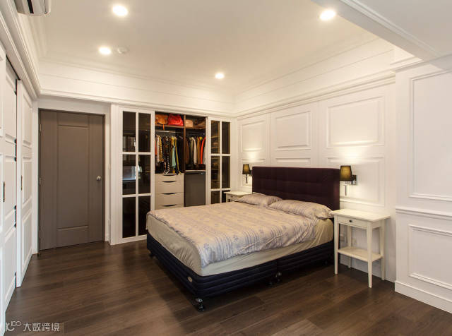 同样以白色线板铺陈典雅的美式氛围,更衣间的拉门延续了厅区的格窗元素,改以白色木作搭配深色玻璃,修饰杂乱的视觉感受。