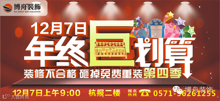 年终巨划算,装修巨头——博舟装饰联手放心工程网、世邦装饰、大宅门高端设计机构及喜雀装饰,年终让利提前开抢!20多家品牌材料商抄底价钜惠,礼献杭城。一天挣下一年工资!12月7日,来杭报二楼,“榔头”砸出抄底价家装优惠,砸出优质家装工程,砸金蛋赢取装修大奖!