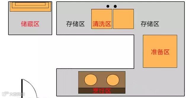 厨房布局最重要的是储藏、准备、清洗、存储和烹饪五大区域,合理的规划应该是从进门开始布局左往右依次是储藏区、清洗区、准备区、烹饪区,存储区穿插在清洗区、准备区和烹饪区之间,根据不同区域的操作需求存储相应的物件。