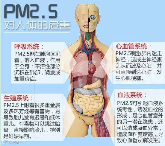 PM2.5主要对呼吸系统和心血管系统造成伤害,包括呼吸道受刺激、咳嗽、呼吸困难、降低肺功能、加重哮喘、导致慢性支气管炎、心律失常、非致命性的心脏病、心肺病患者的过早死。老人、小孩以及心肺疾病患者,是PM2.5污染的敏感人群。