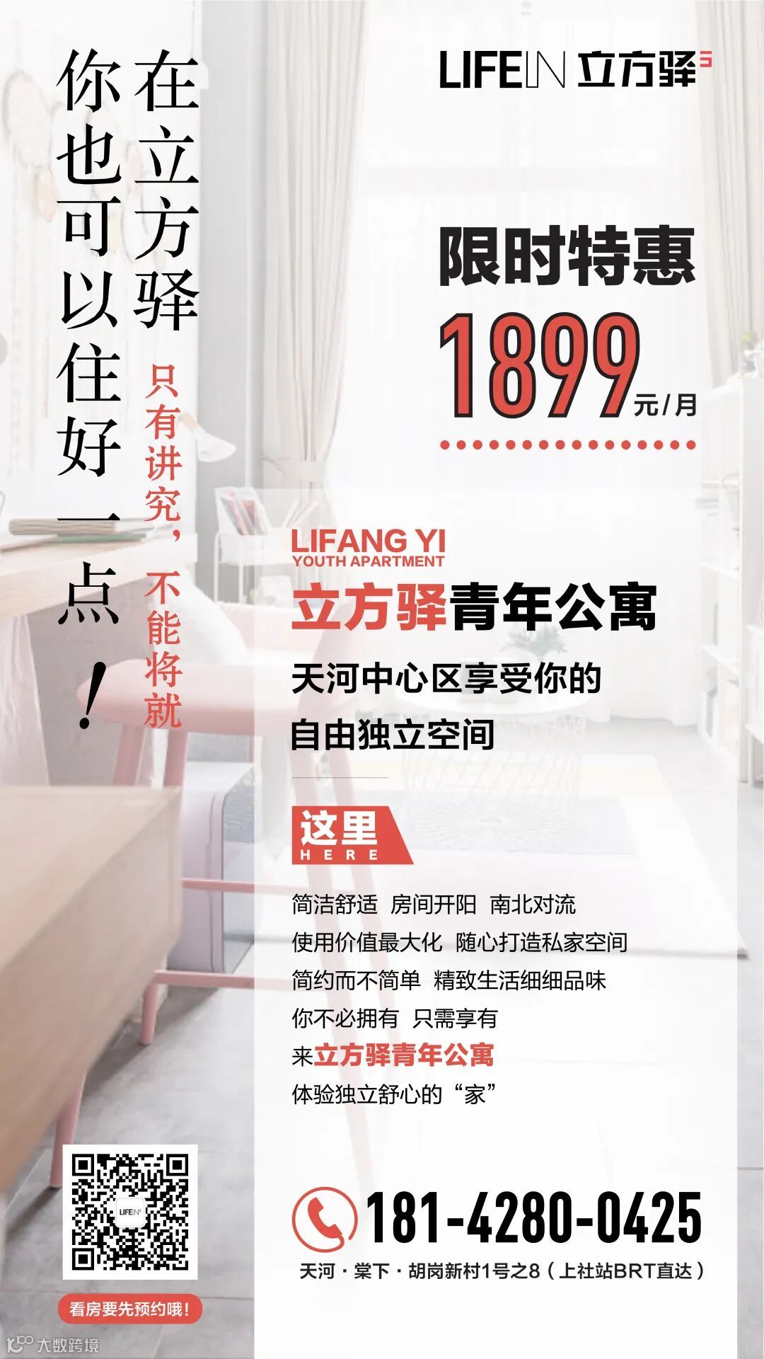 位处天河城央,紧邻天河公园、BRT出入非常方便,周边配套完善,只有你想不到的,没有满足不了你的。现在致电只需1799起就能入住。咨询热线:181-4280-0425