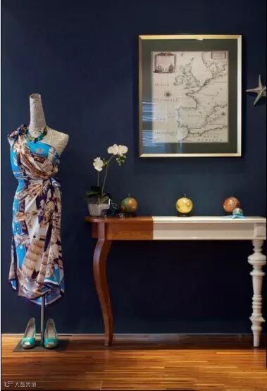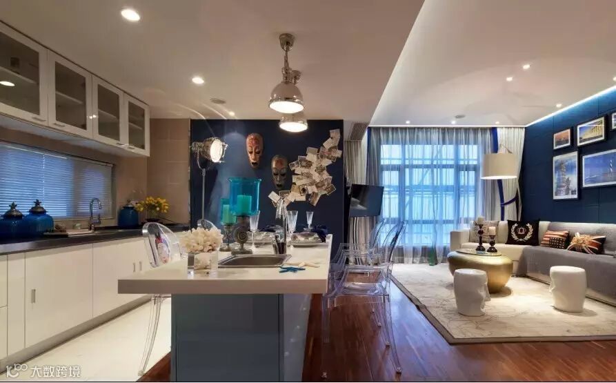 这是一个女性主题的案例,业主是位女服装设计师,由于工作的原因会世界各地飞。如果,一个人既懂得享受安静的独处,又了解如何在房间中搭载想象就能做一次惬意的旅行。那么适合他/她的,一定是这样一个以旅行为线索,贯穿整个空间的家。蔚蓝色的色调基础上,配带灰蓝、乳白、赭褐色的自然纹木地板,再糅入麻质感的柔软布料,海洋、大地原始淳朴的气息扑面而来。各种带有强烈异域文化的饰品,作为空间中的点睛之笔,契合了旅行的主题,又能让人的心智在有限的空间里就能心驰神往到遥远的异国他乡。
