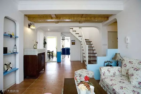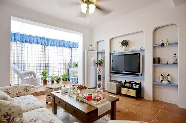 因为本身就是以地中海田园风为主,整个房间在这两种风格的混搭下其实很容易会让空间变的有点杂,让墙面留白来平衡整个客厅的空间感,而客厅中的电视背景墙则以立体墙面的形式来设计,墙面上以圆角与象征地中海的蓝色来突出整体风格,墙面上的储物搁架既简约又让这一墙面显得很具实用性。还利用了客厅旁的阳台空间抬高了地面来划分出区域,在阳台上种了些绿色植物,感觉很是惬意呀。