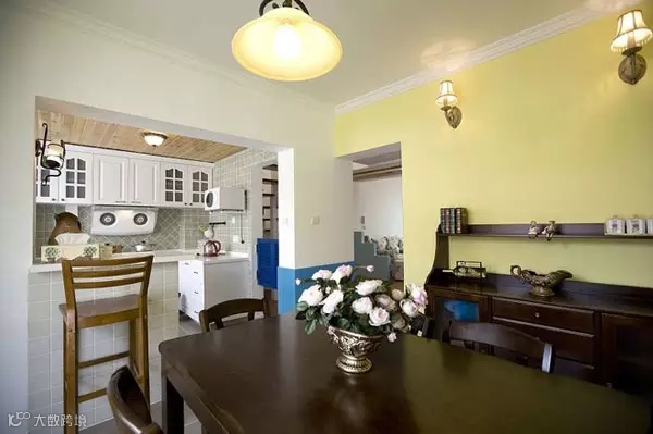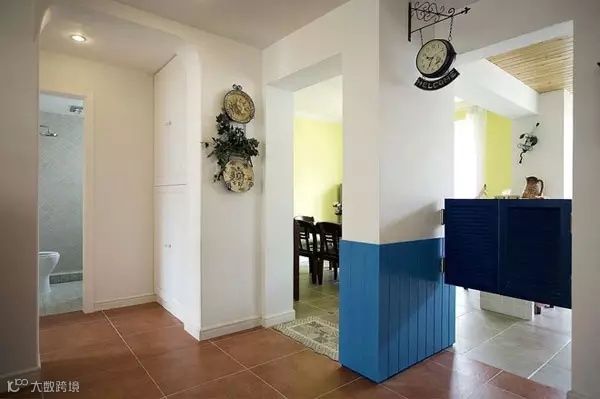 在厨房门外能看出整个餐厨区域的开放式格局,厨房门口的墙面上挂上一台别致的挂钟,朋友到家里来的时候都说挂在这边与厨房的门很相配,有种真的身在地中海的感觉。