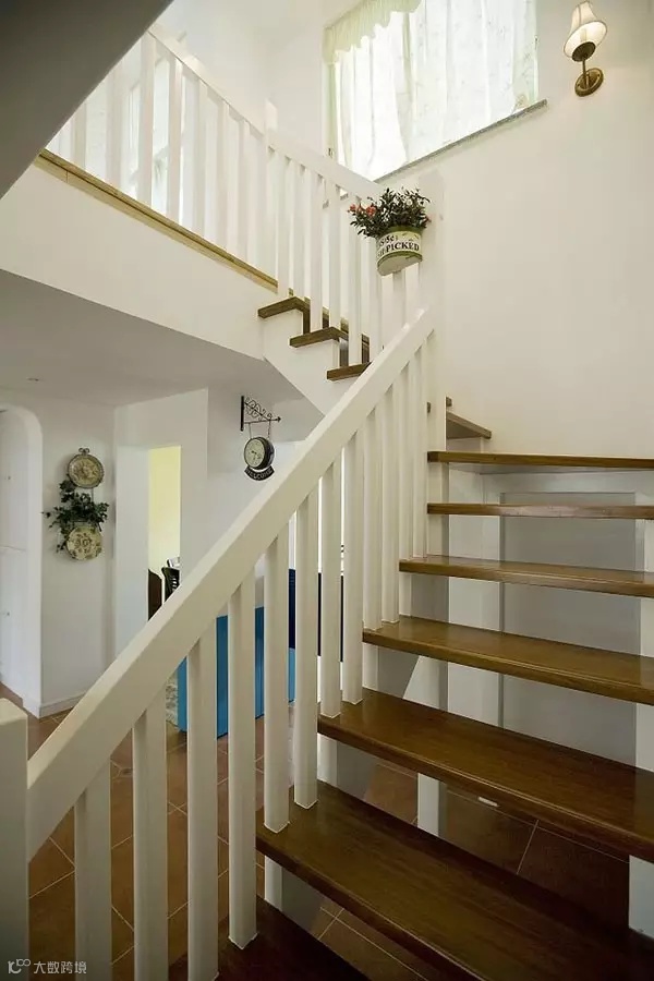 厨房一旁,木质阶梯与白色扶手结合打造出通往2楼的楼梯,在楼梯上只是稍稍做了些小装饰,感觉就这样简简单单的的就很美。