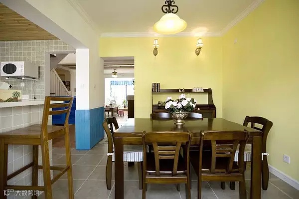 从客厅经过走道就来到了餐厨区域了,整个空间布局还是很宽敞舒适的,用餐区的墙面选用了淡黄色涂料来涂刷,总觉得这种色会在视觉感官上带给用餐者愉悦的心情,深色木质餐桌椅放置于这一空间之中,有种恰到好处的感觉,墙面上的暖色小壁灯为这一区域增添了不少温馨感,即便是平时有亲戚朋友到家中来做客也足够在这张餐桌边坐下一同用餐咯。