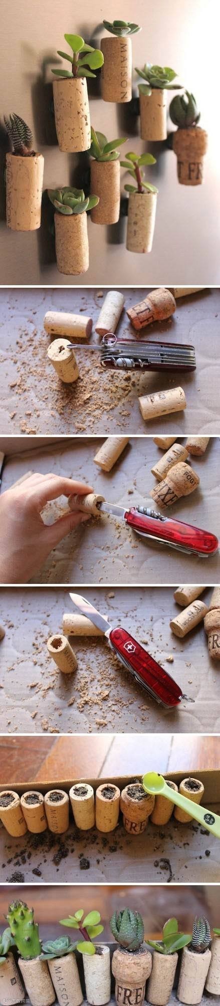 18.软木塞植物盆景:这些软木塞的多肉植物盆景非常可爱,袖珍而精致,在木塞上黏上吸铁石还能做成冰箱贴,是不是很有创意~