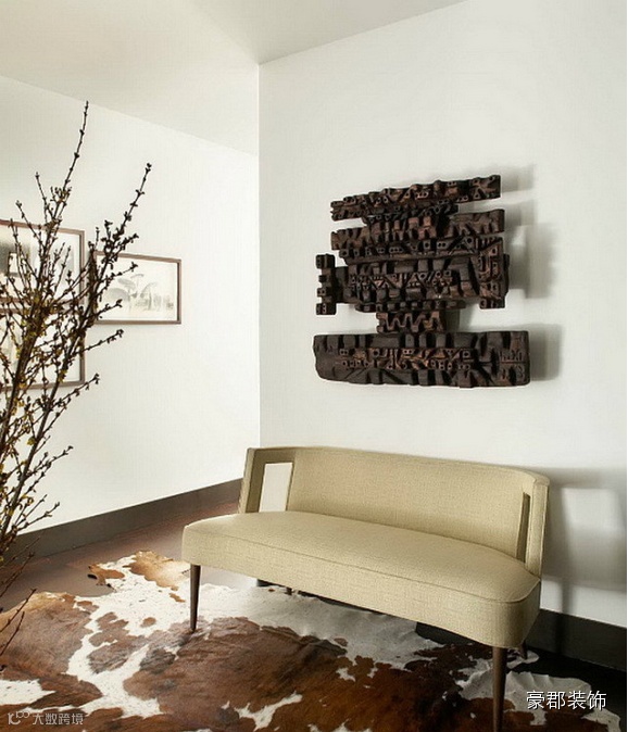 黑色与白色嵌套的双色地毯,暗暗吻合了空间与家具的色彩与构成。以方块单元组合而成,在深浅上呈现出错落有致的精致效果,为开阔的空间带来视觉上的温暖叠加。