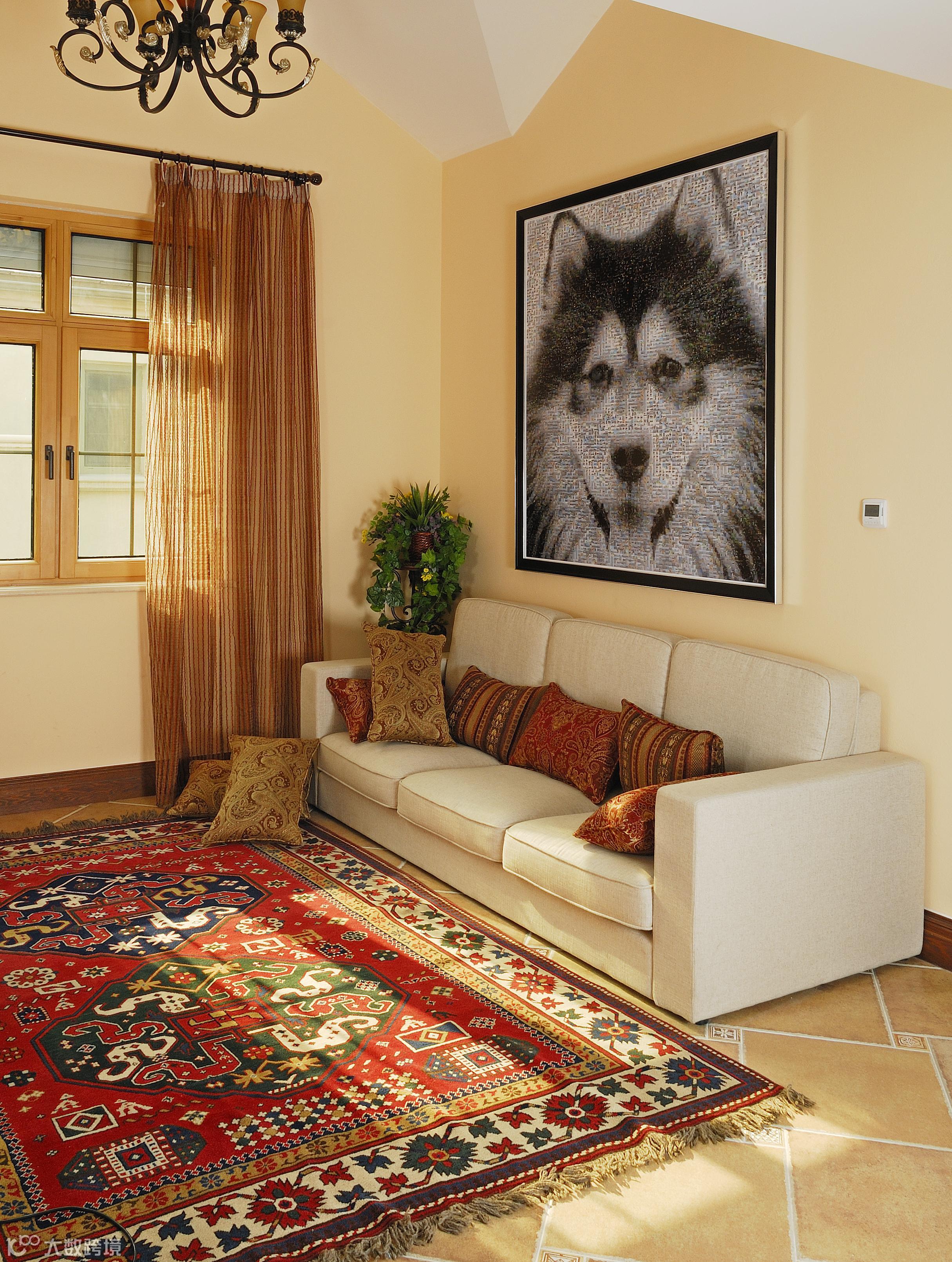 亚麻质地的沙发和靠包、名族风图案的地毯,整个客厅洋溢着浓郁的异国风情。地毯是将异域风情发挥到极致的点睛之作,散发着干净、神秘的感觉。