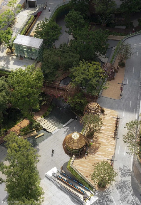 3)景观运用自然种植软化城市边界,并在人的尺度里提供视觉和听觉的阻挡, 保证人行通道的通行性 ,景观设计不能仅仅停留在视觉效果的呈现上,还需要思考设计能够为场地带来更多可能性。设计师从运营的角度,打造系列趣味装置,吸引人们参与其中,为后续进驻的商业预留更多可能性。