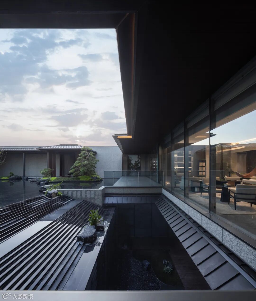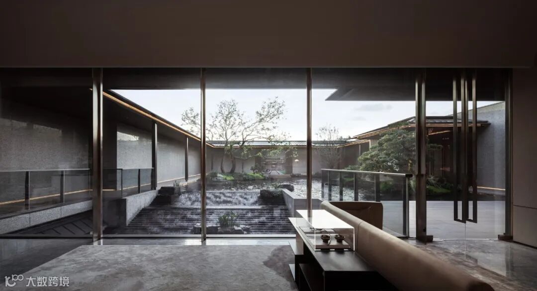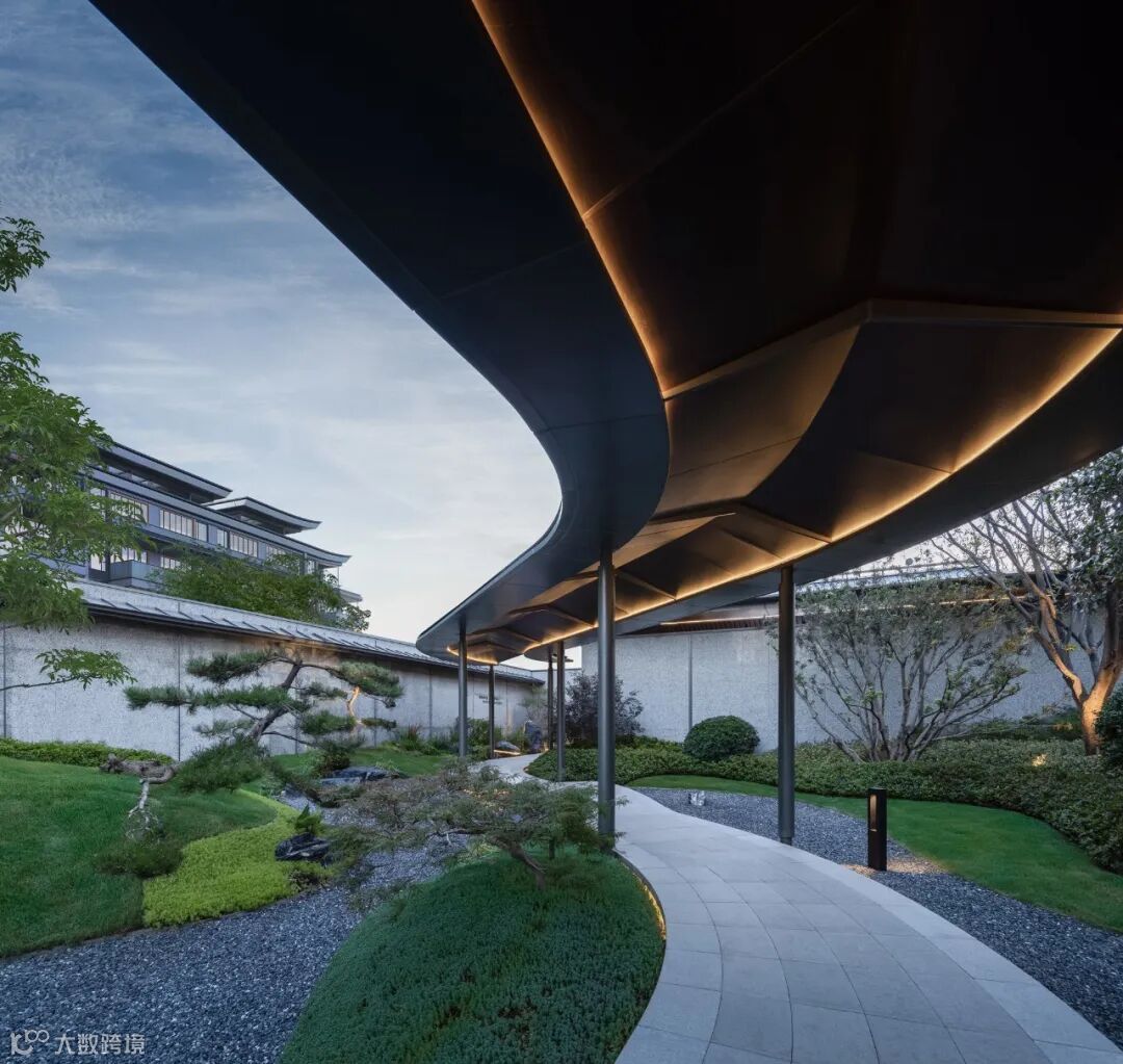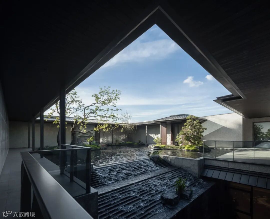 廊道深处,可见斜坡内凹屋檐跌水。一片一片砖瓦叠放,带动中庭空间节奏的抑扬顿挫。身临其境,放空心绪,返璞归真,便能感受隐奢大境带来的自然与治愈。