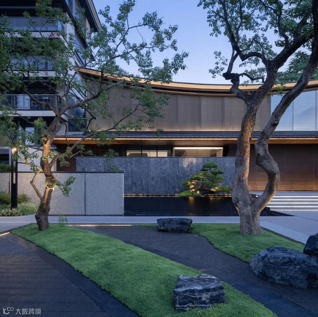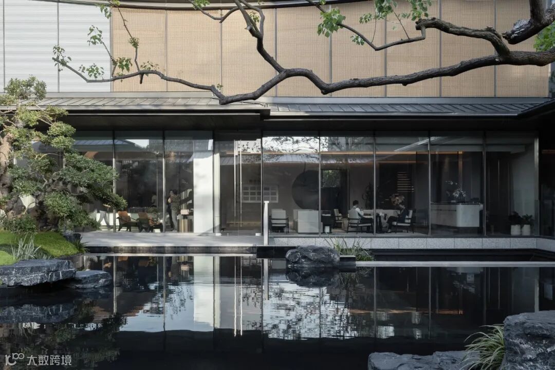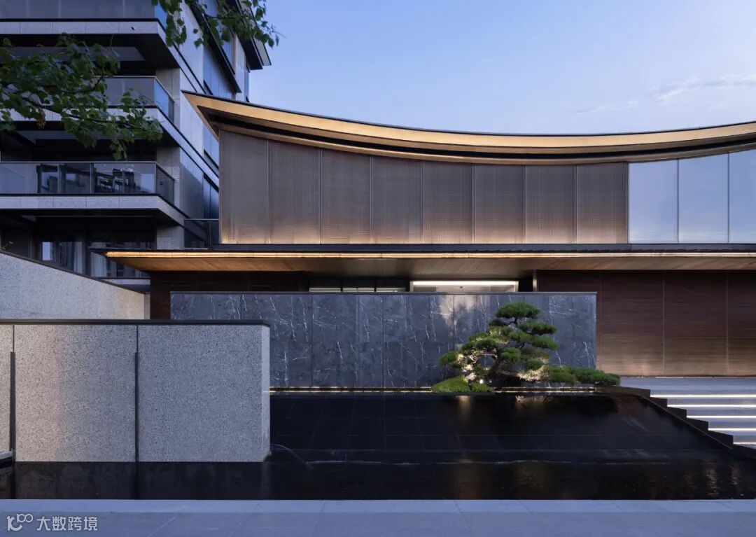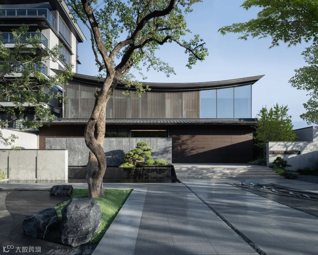 起翘的“飘顶”下方,是通透、大面的极简玻璃窗,形成了“全面屏”的效果。石材、铝板、LOW-E玻璃、木纹材料、毛石材料等材质肌理,重在以纯粹的质感表达,静谧、隐奢、禅意底色,唤起人们对传统建筑与生活的记忆。