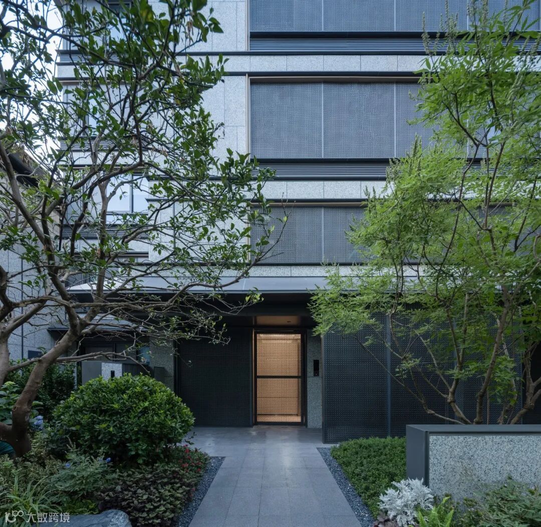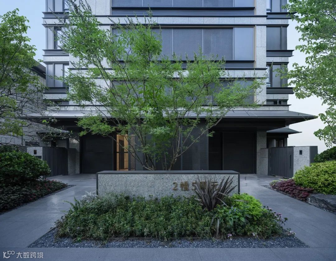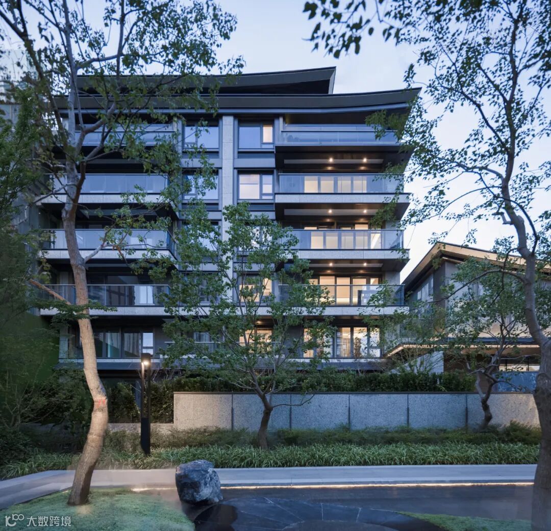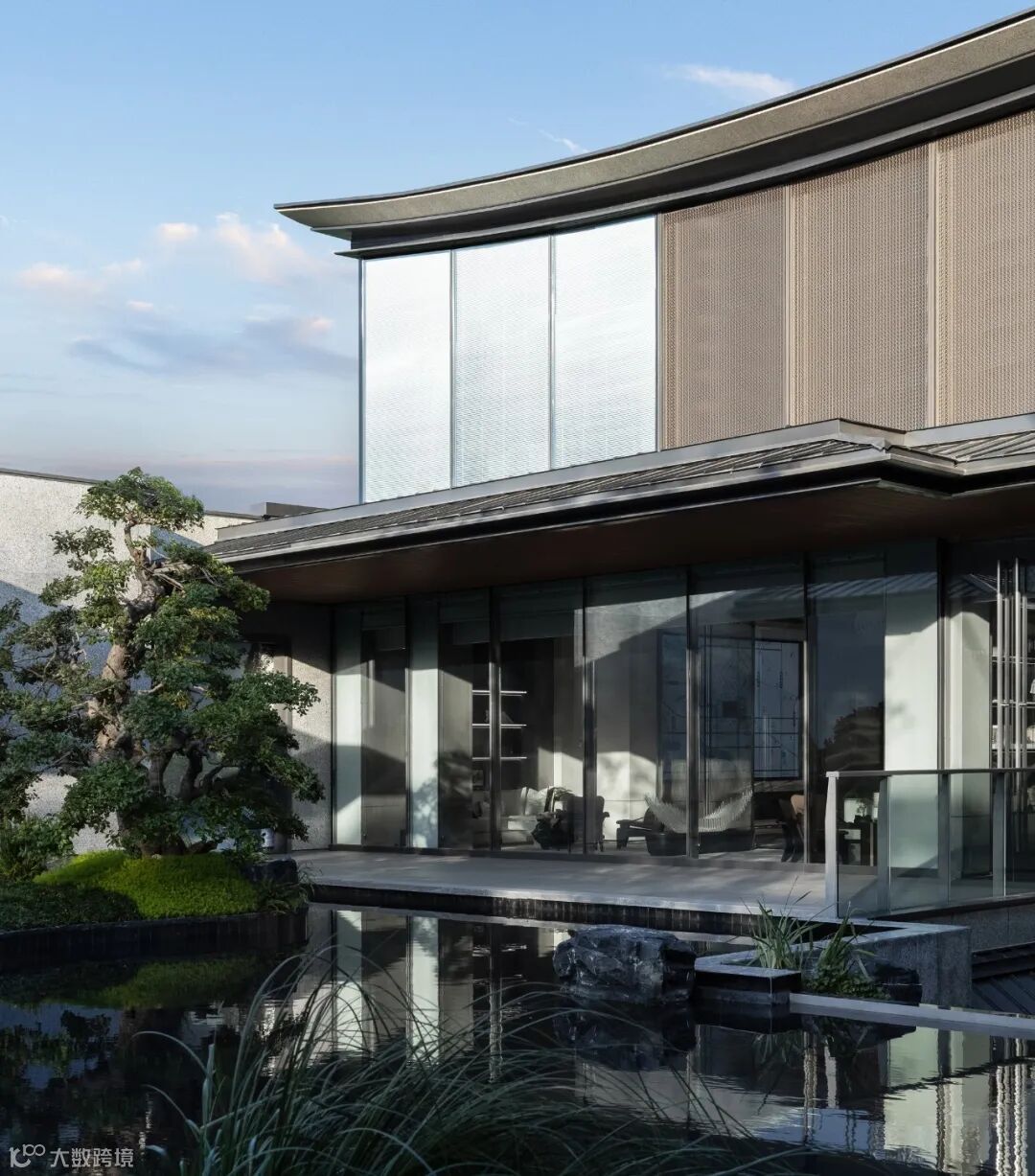 起翘的“飘顶”下方,是通透、大面的极简玻璃窗,形成了“全面屏”的效果。石材、铝板、LOW-E玻璃、木纹材料、毛石材料等材质肌理,重在以纯粹的质感表达,静谧、隐奢、禅意底色,唤起人们对传统建筑与生活的记忆。