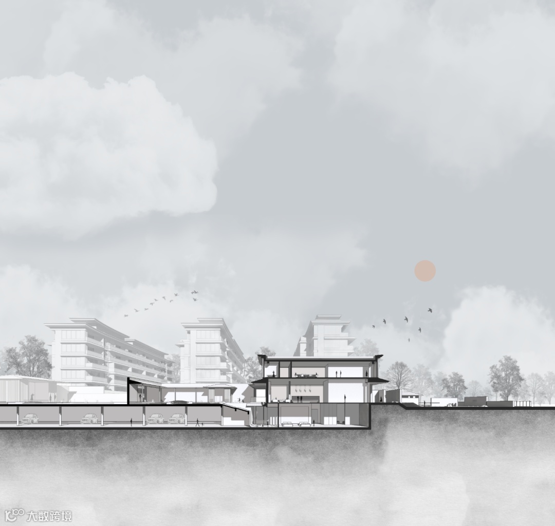 悠久的古渡口和驿站文化催生了一种太湖独有的船只——七桅古船,通过运用抽象笔法,依循古船造型来形成整个建筑立面的骨架。同时,结合无锡传统建筑中屋脊、檐口起翘的建筑形态,将略微起翘的屋面安放在建筑屋檐处,使得厚重的建筑瞬间形成一种昂扬起飞的形态。