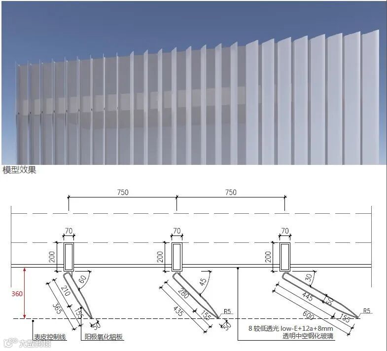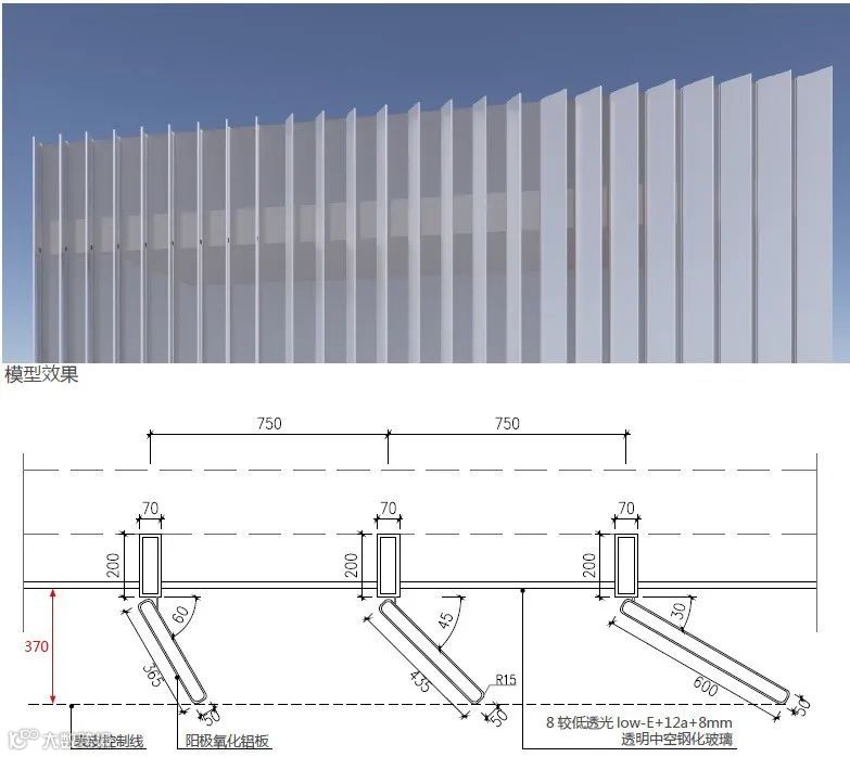 在建筑确定的形态关系下,对外表皮铝板材质的形状、尺度、角度等细节进行多次推敲,经过与幕墙专业单位的多轮可行性探讨,深化模块做法及连接关系,对实物样板效果精益求精。