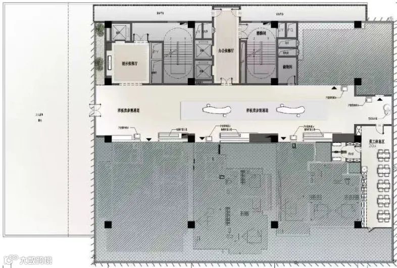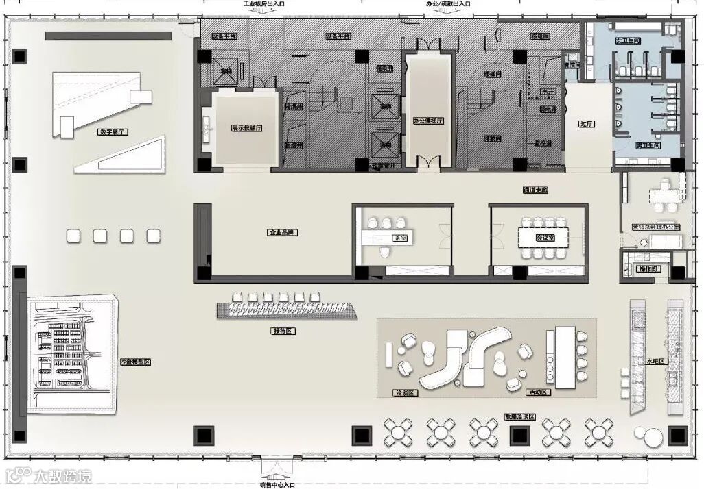 展示中心的主要展示面为西侧道路,将停车区居于东侧一角,可最大化保证建筑及景观空间的完整性。结合该街区的尺度街景,考虑建筑的高度与体量,运用建筑的设计语言呈现产业城的定位形象。