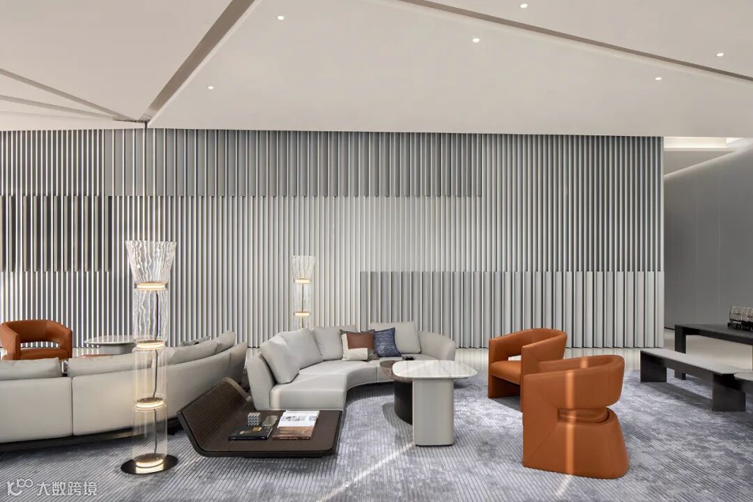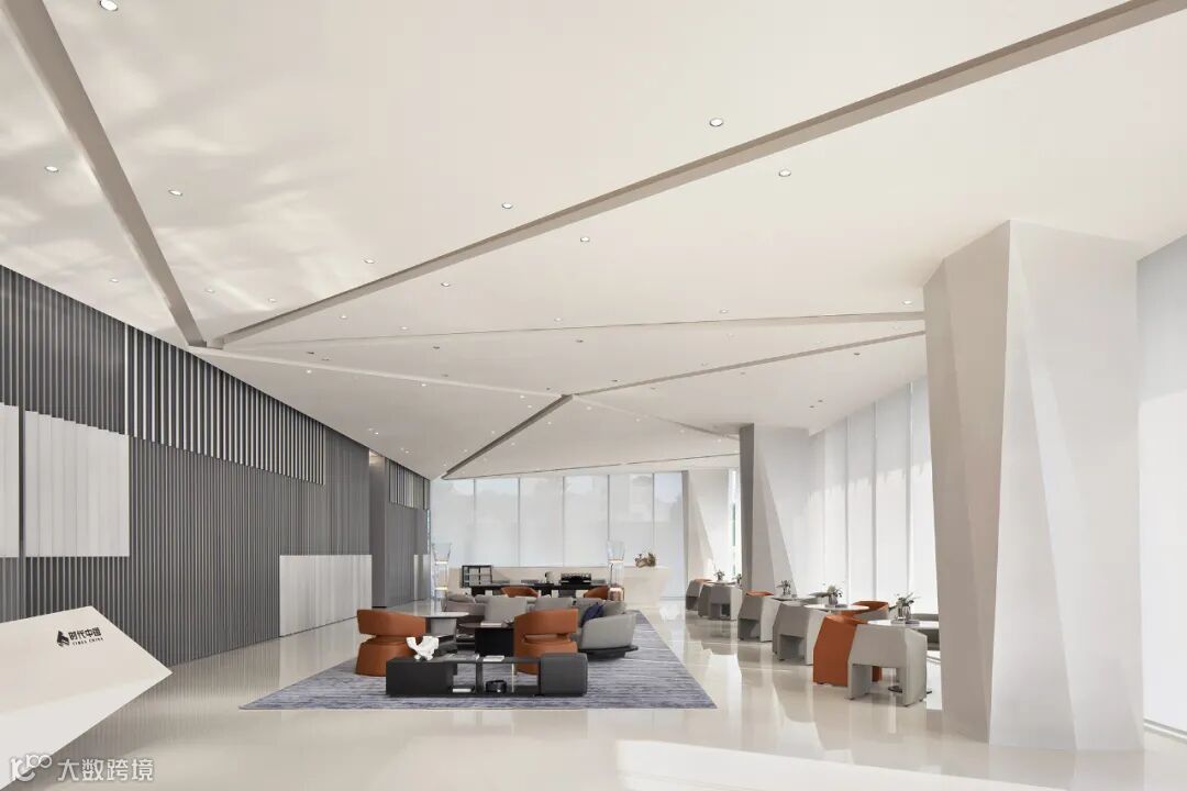 前台背景墙延续建筑外立面造型,天花的折线设计加强空间的纵深感。软装家具以黑白灰色调为主,局部穿插橙色单椅,为空间中增添一份温度。