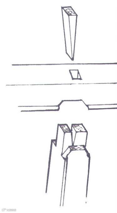 是在两顺向木材之间凿眼垂直栽上的薄方木片,以联结固定二者间的位置。如在桌面心板之间,床牙板与大边之间等等。