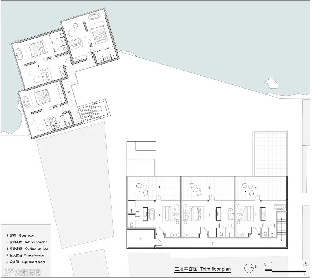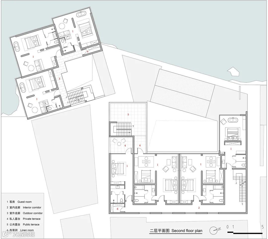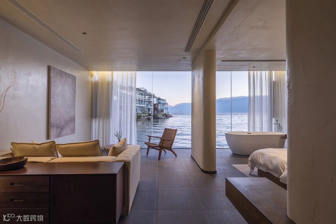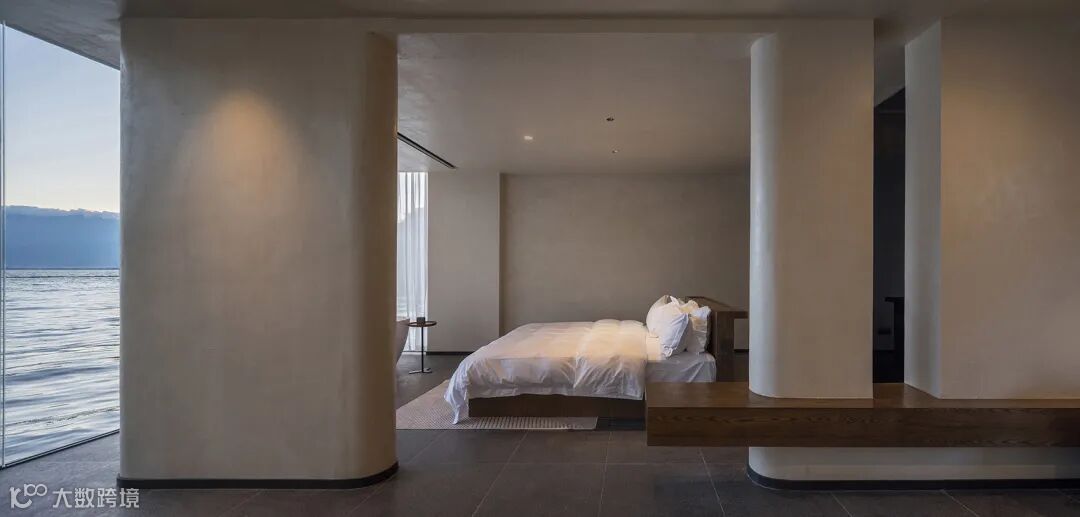减少客房数量,但保证舒适度和视野,完善公区配套设施。这些满足了人们对度假旅居质量越来越高的需求。同时,空间塑造上力求质朴简约,但舒适。新建筑希望呈现给客人一种追古溯源般的心灵归隐感。