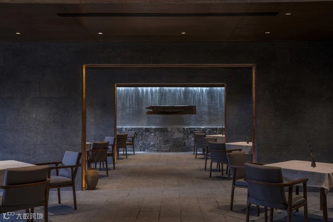 室外的庭院是餐厅空间的延续:餐台既出现在室内,也是外立面的一部分,它延伸到庭院里,成为有故事的背景墙。水从餐台流出,滋养着繁茂的蕨类植物,几经扭转,叠级而下,流入圆形的水池。几条弧线划分出客人从大堂至餐厅的步行路径,配以青石板路、红枫、碎石铺地和水池,所谓“内为美食,外如美酒”。