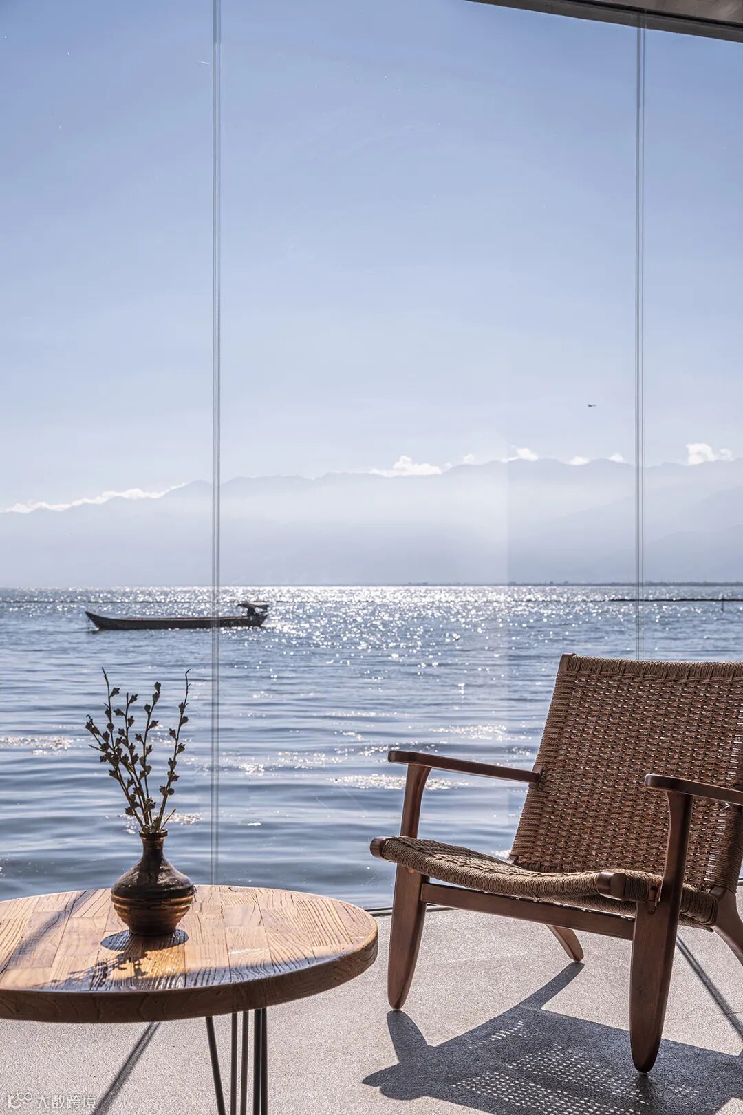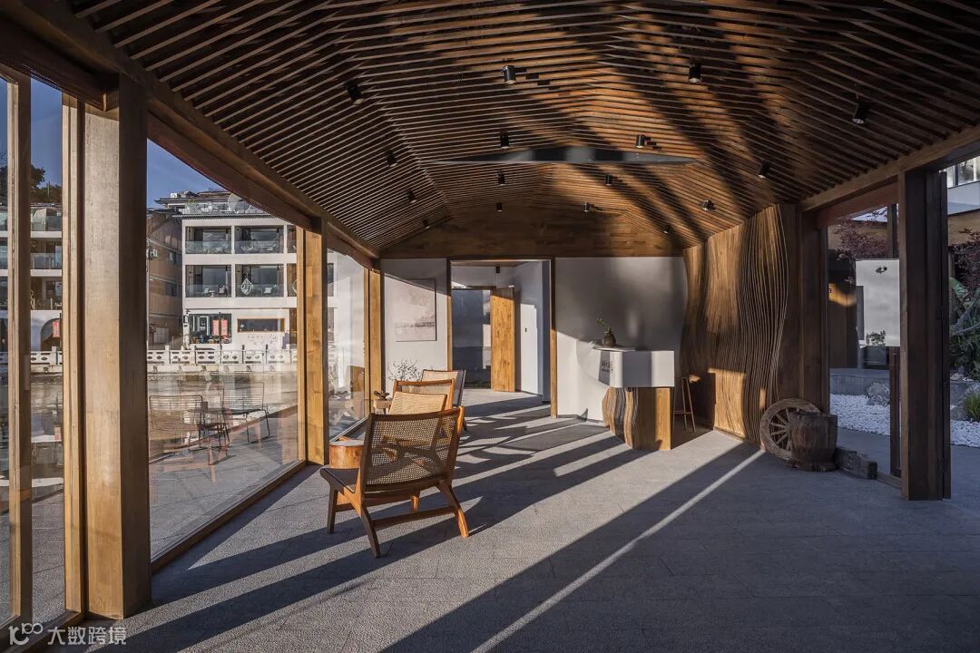 进入大门迎接客人的是大堂。在大堂入口处设置大面积实墙,保留神秘感;进入大堂后,豁然开朗,大面积的落地玻璃使洱海风光尽收眼底。前台与咖啡吧台分别置于两侧,避免流线交叠。吊顶采用木格栅,微妙的角度变化在大堂上空形成了一条优雅的弧线,格栅之间隐约可见建筑的原始结构。