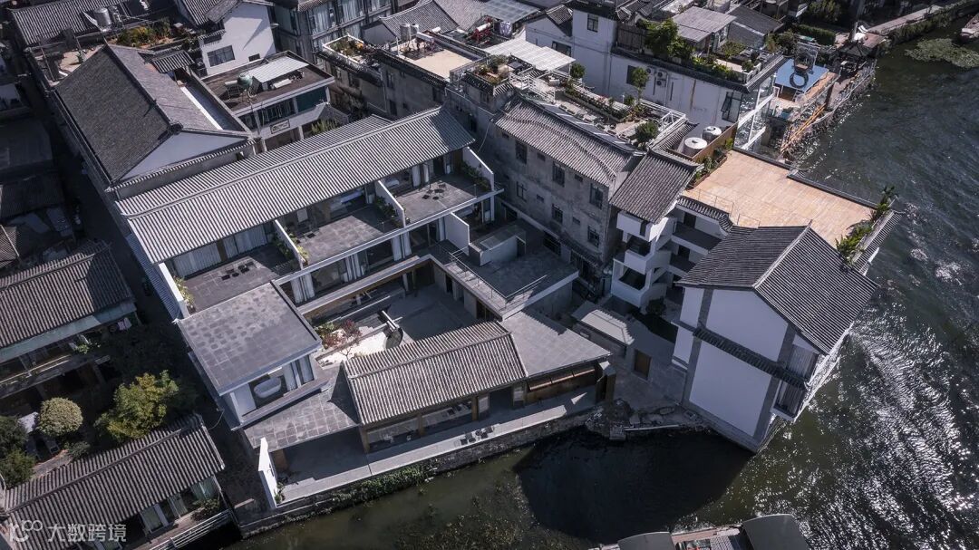 在布局上,建筑师对两个院子的交通流线进行了梳理。庭院房北侧的巷子相对于两个院子之间的小巷更为通达,景观视野也更佳。设计选择这条巷子作为接送游客到店的主路。进入酒店区域内,第一个空间是酒店大堂,兼具前台接待以及咖啡酒吧功能。同时,大堂也是客人重要的分流节点,从西北一侧出口沿洱海向南走,进入海景房小院,从东南一侧进入内庭院,可达健身房、VIP茶室及餐厅。