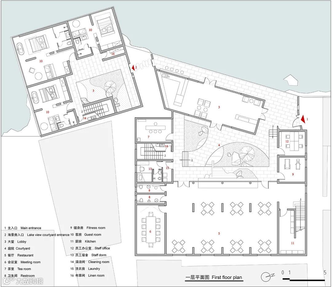 将原建筑一层的客房全部打通,改造成开敞的餐厅。餐厅与大堂形成两个并置的空间,隔庭院而望。庭院成为了一个天然的缓冲区,如“呼”与“吸”之间微小短暂的间隙。员工办公室和员工休息室则被布置在了一层北侧和南侧的耳房,方便员工管理整个酒店区域。